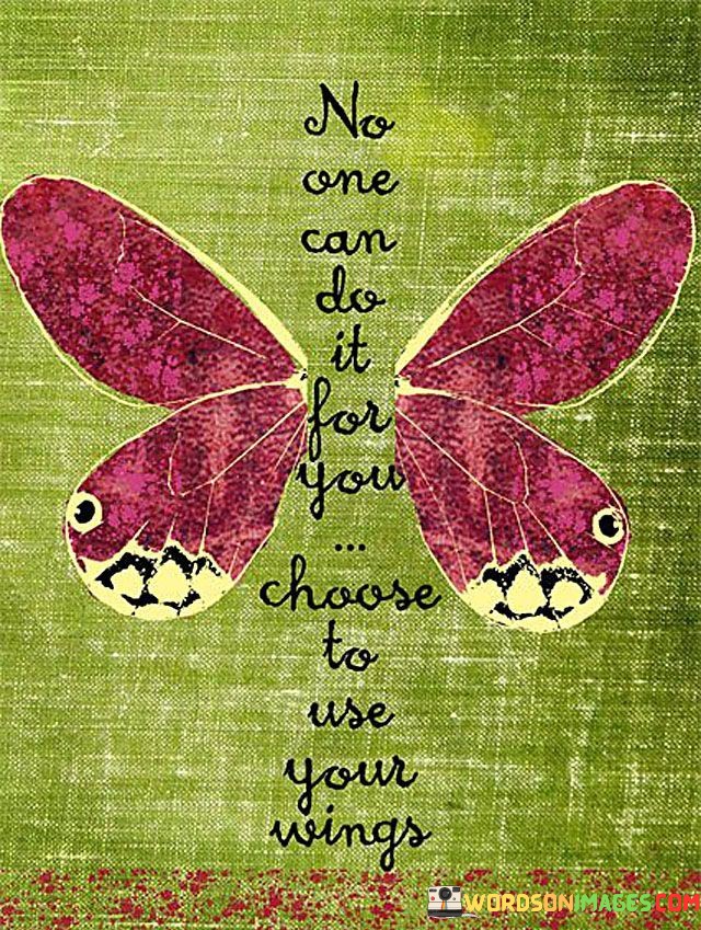 The quote "no one can do it for you, choose to use your wings" conveys the idea of personal responsibility and empowerment. It suggests that individual action is required for personal growth, and using one's "wings" metaphorically represents taking initiative and making independent choices.