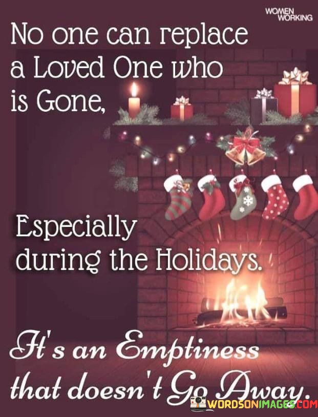 The quote conveys the enduring grief of losing a loved one, particularly during the holiday season. "No one can replace a loved one who is gone" underscores the irreplaceable void left by their absence. "Especially during the holidays" highlights the season's significance, which can intensify the sense of emptiness. The quote conveys the lasting emotional impact of such loss.