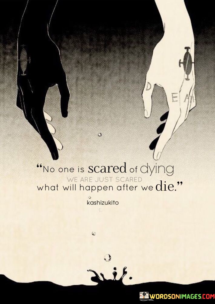 The quote explores the fear of the unknown beyond death. In the first paragraph, it introduces the concept: "no one is scared of dying." This suggests that the fear isn't about the act of dying itself.