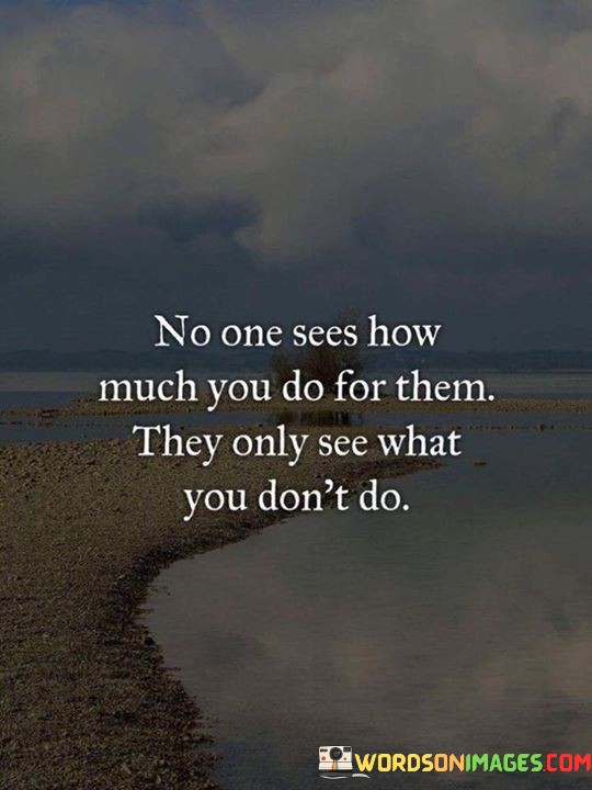 This quote points out the common tendency for people to overlook the efforts and contributions that someone makes for them, focusing instead on what they perceive as lacking. It suggests that the positive actions and contributions go unnoticed while any perceived shortcomings are magnified.