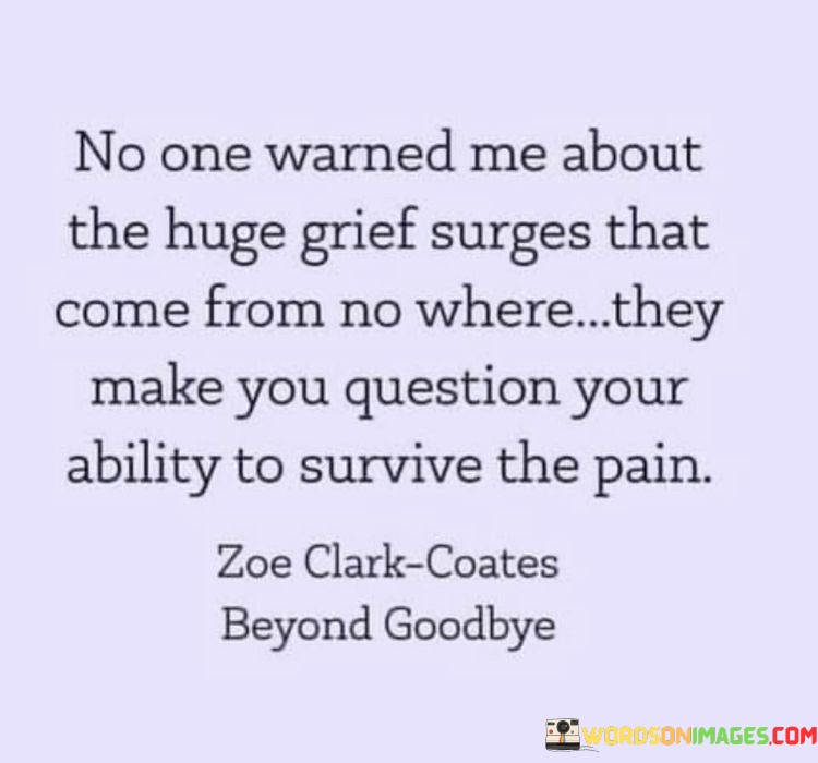 The quote reflects on the unpredictability of grief. "Huge grief surges" implies sudden, intense waves of sorrow. "Question your ability to survive" suggests the emotional toll. The quote conveys the overwhelming nature of grief and its impact on one's sense of resilience.
