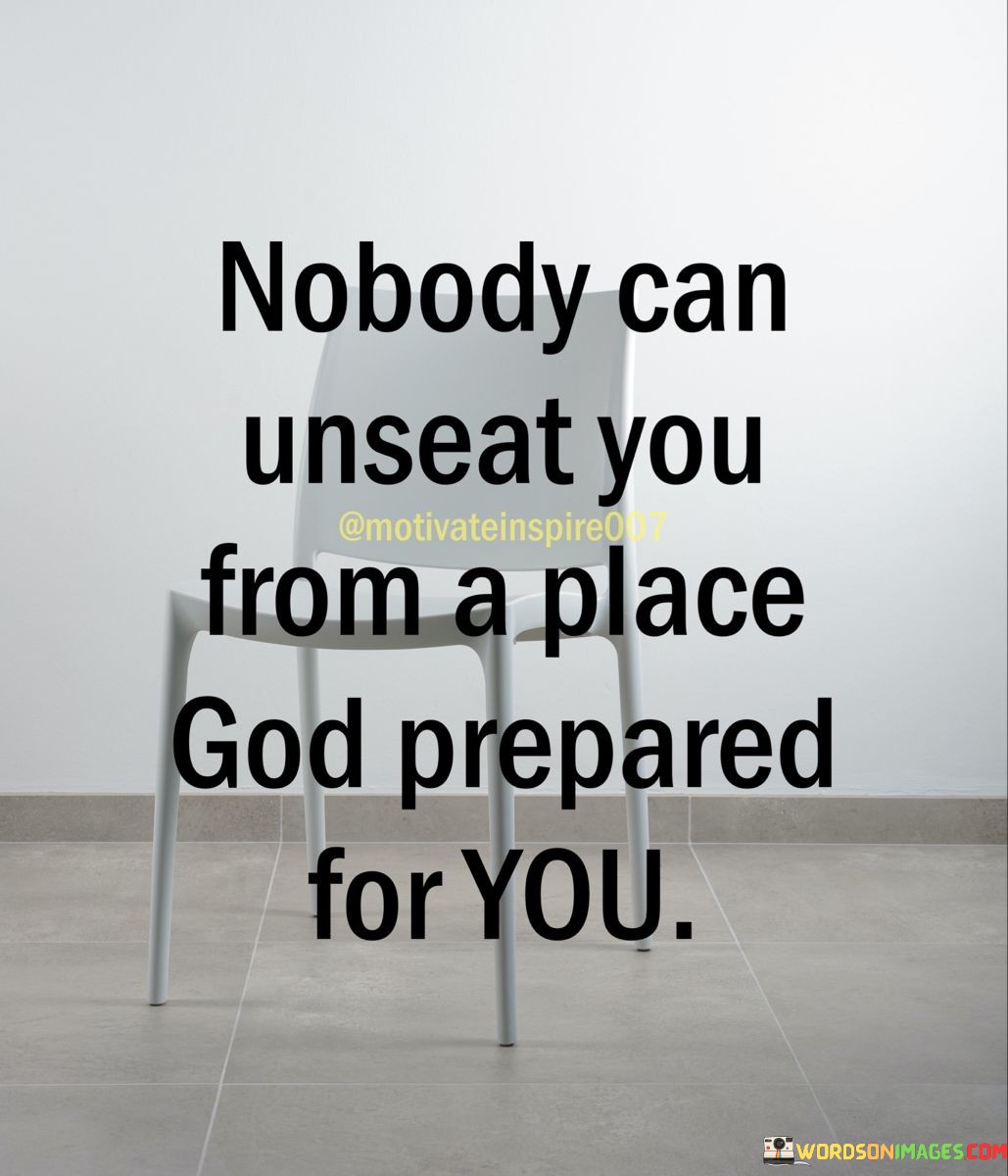 The quote suggests that when God has prepared a specific place or purpose for an individual, nothing and no one can displace them from that destined position. It underscores the idea that God's plan is unwavering and unstoppable, and those who trust in Him can have confidence in their path.
