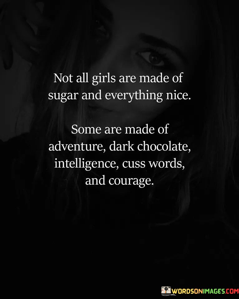 "Not all girls are made of sugar and everything nice. Some are made of adventure, dark chocolate, intelligence, cuss words, and courage" suggests that women come in various personalities and characteristics, and they are not limited to conventional expectations.