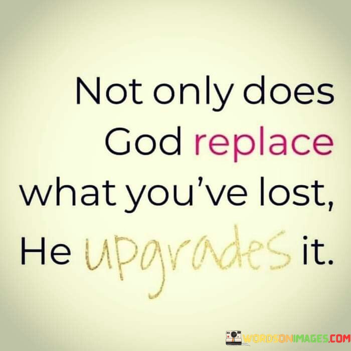 This quote conveys a message of faith and trust in God's ability to not only restore what has been lost but also to improve upon it. It suggests that when individuals experience loss or setbacks, God has the power to provide something even better in its place.