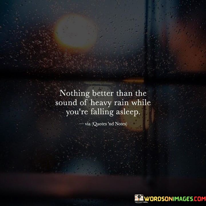 The quote evokes a sense of comfort and tranquility. "Sound of heavy rain" implies a soothing, natural rhythm. "While you're falling asleep" signifies a serene bedtime setting. The quote conveys the calming effect of rain's sound on the mind.