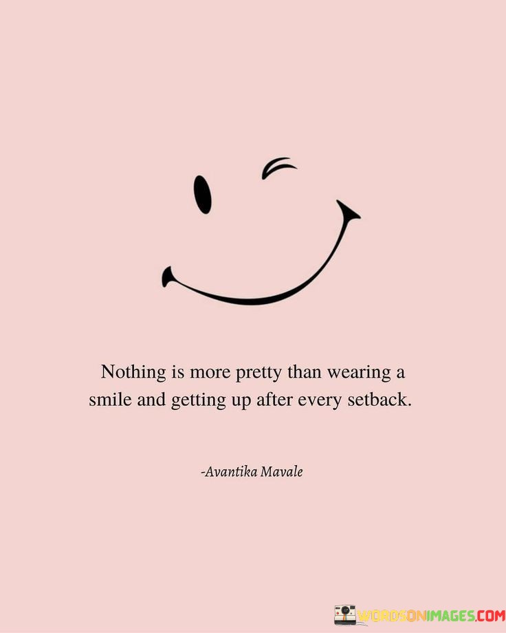 The quote underscores the beauty of resilience and perseverance. It suggests that there's nothing more attractive or inspiring than seeing someone face challenges with a smile and continue moving forward after each setback. The quote celebrates the strength and determination displayed in such moments.