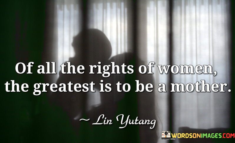 This quote celebrates the profound significance of motherhood as one of the most essential and cherished rights of women. The phrase "Of all the rights of women, the greatest is to be a mother" acknowledges the unique and irreplaceable role that mothers play in shaping the course of humanity. It affirms the immense value and privilege of bringing new life into the world, nurturing and raising future generations with love, care, and dedication. In this quote, motherhood is recognized not just as a biological function but as a profound human experience that transcends cultural, social, and historical boundaries.The quote highlights the intrinsic connection between women and motherhood, acknowledging the deep-rooted and universal desire of many women to become mothers. It underlines the transformative power of motherhood, as it instills a sense of purpose and responsibility, fostering strong bonds between mother and child. Furthermore, this quote also carries the message that motherhood is a choice, emphasizing the importance of recognizing and respecting the autonomy of women in deciding whether or not to become mothers.In a broader context, this quote speaks to the societal significance of motherhood, as mothers play a critical role in shaping the values, morals, and well-being of future generations. It acknowledges the countless sacrifices and efforts made by mothers in nurturing and guiding their children to become responsible, compassionate, and successful individuals. The quote also serves as a reminder of the need to support and empower mothers, providing them with the necessary resources and recognition to fulfill their role effectively.However, it is essential to acknowledge that while motherhood can be a profoundly fulfilling and rewarding experience for many women, not all women choose or are able to become mothers. The quote should be interpreted in a way that respects and celebrates the diverse choices and paths that women may take in their lives, recognizing that motherhood is but one of the many valuable roles and contributions women can make to society.