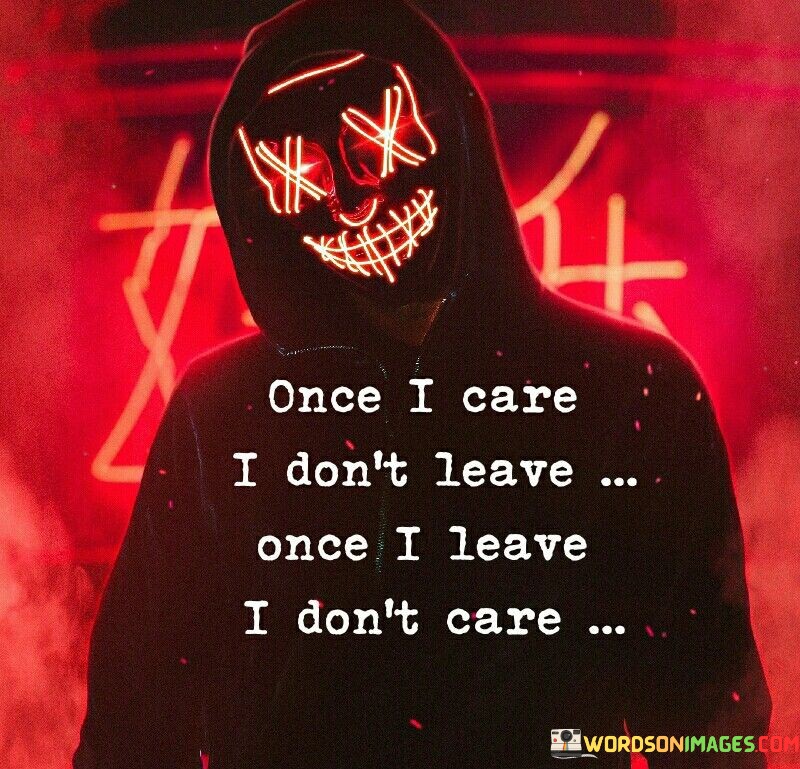 The quote encapsulates the dynamics of attachment and detachment. When someone cares deeply, they invest emotionally, making it difficult to leave. After leaving, the emotional investment wanes, and the intensity of caring diminishes. It reflects the complexity of human emotions and how they shift with changing circumstances.