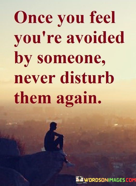 The quote, "Once you feel you're avoided by someone, never disturb them again," conveys a powerful message about self-respect, boundaries, and the importance of recognizing when to let go of certain relationships. It suggests that when we sense avoidance or disinterest from someone, it is essential to respect their feelings and choices by refraining from pursuing further interactions. The quote highlights the significance of valuing our own emotional well-being and not forcing ourselves into situations where we feel unwanted or unappreciated. By accepting the signs of avoidance and choosing to step back, we honor our own self-worth and create space for healthier and more fulfilling relationships. Ultimately, the quote serves as a reminder to prioritize our emotional health and to understand that not all connections are meant to last, emphasizing the importance of letting go with grace and finding solace in valuing ourselves and those who reciprocate our feelings and efforts. At its core, the quote celebrates the concept of self-respect and emotional boundaries. When we sense that someone is avoiding us or not reciprocating our interest or friendship, it is crucial to recognize the importance of preserving our emotional well-being. Continuing to pursue or disturb such individuals may lead to feelings of rejection, hurt, and frustration, which can adversely affect our self-esteem and mental health. By accepting the signs of avoidance and choosing to respect the other person's choices, we empower ourselves to maintain our self-worth and emotional integrity. Moreover, the quote speaks to the idea of letting go with grace and finding peace in detachment. Instead of holding onto relationships that no longer serve us or attempting to force connections with those who are not interested, we embrace the art of letting go and making room for new opportunities and relationships that align with our values and desires. Furthermore, the quote underscores the significance of recognizing when a relationship has reached its natural conclusion. Not all connections are meant to be lifelong, and it is crucial to acknowledge that people may come into our lives for a season and then drift away. By understanding this ebb and flow of relationships, we free ourselves from the burden of trying to control or maintain connections that have run their course. In conclusion, the quote "Once you feel you're avoided by someone, never disturb them again" conveys a valuable lesson about self-respect, emotional boundaries, and the art of letting go. By recognizing signs of avoidance and choosing not to disturb those who are disinterested, we honor our emotional well-being and prioritize self-respect. Understanding that not all relationships are meant to last forever, we find solace in embracing detachment and creating space for new connections that align with our values. Ultimately, this quote serves as a reminder to value ourselves, let go with grace, and cultivate healthier and more fulfilling relationships that contribute positively to our lives.