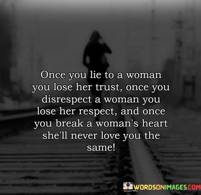 "Once you lie to a woman" highlights the critical point where deception occurs. It underscores the significance of honesty as a foundation of trust in any connection.