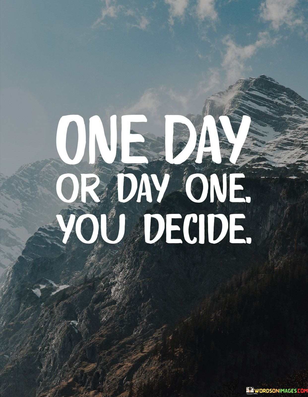 The quote underscores the importance of making decisions. "One day" symbolizes inaction and complacency, while "day one" embodies initiative and determination. It encourages you to choose when you want to start pursuing your ambitions. This quote serves as a motivational reminder that your future is determined by the decisions you make today.