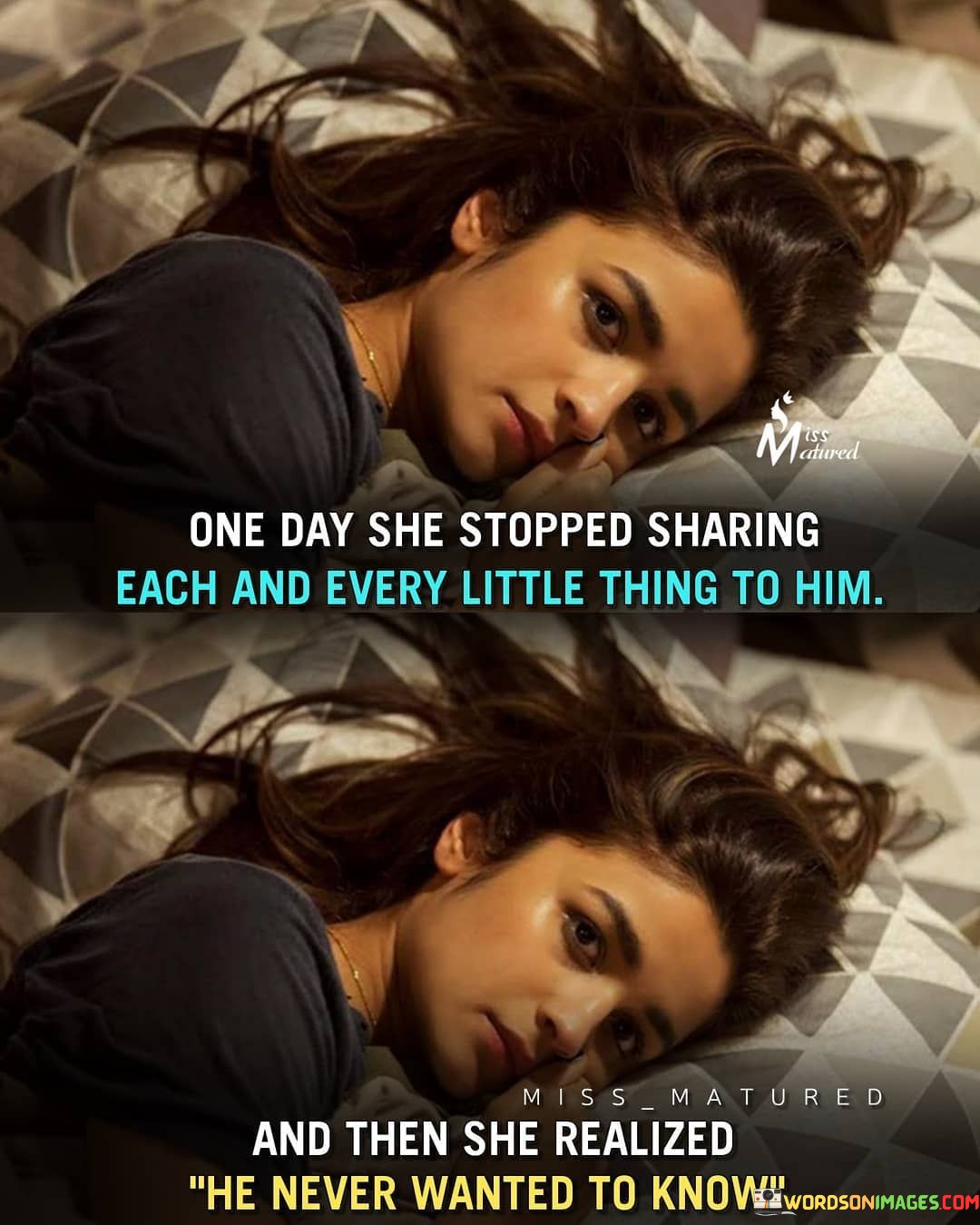 "One day she stopped sharing each and every little thing to him, and then she realized he never wanted to know" suggests that the woman used to share every detail of her life with him, but eventually decided to withhold information.
