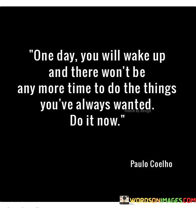 The quote underscores the urgency of pursuing dreams. "One day you will wake up" alludes to the unpredictability of time. "No more time to do the things you've always wanted" emphasizes the finite nature of life. The quote urges seizing opportunities without delay.