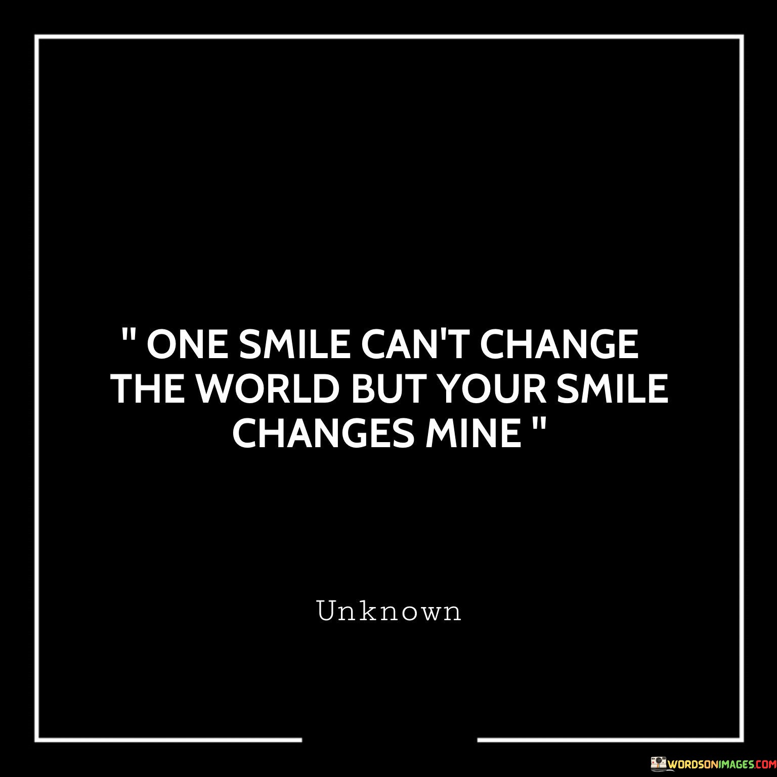 The quote beautifully captures the personal impact of someone's smile. "One smile can't change the world, but your smile changes mine" acknowledges the individual influence of a person's smile on the speaker's life.