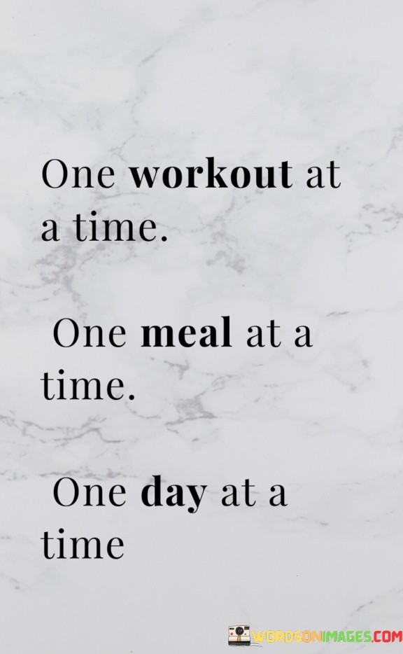 The phrase underscores a methodical journey to wellness. "One Workout At A Time" signifies exercise commitment. "One Meal At A Time" promotes dietary mindfulness. "One Day At A Time" encapsulates the notion of taking each moment as it comes, fostering a patient and gradual path to health.