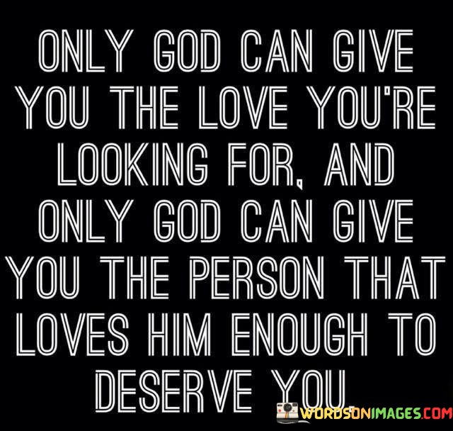 The quote, "Only God can give you the love you're looking for, and only God can give you the person that loves Him enough to deserve you," underscores the divine source of love and the importance of shared faith in relationships.