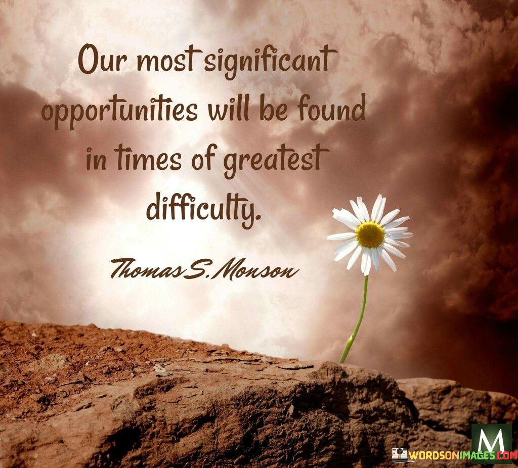 This statement highlights the potential for growth during challenging periods. "Our Most Significant Opportunities Will Be Found" suggests valuable chances. "In Times of Greatest Difficulty" indicates that these opportunities arise during tough moments.