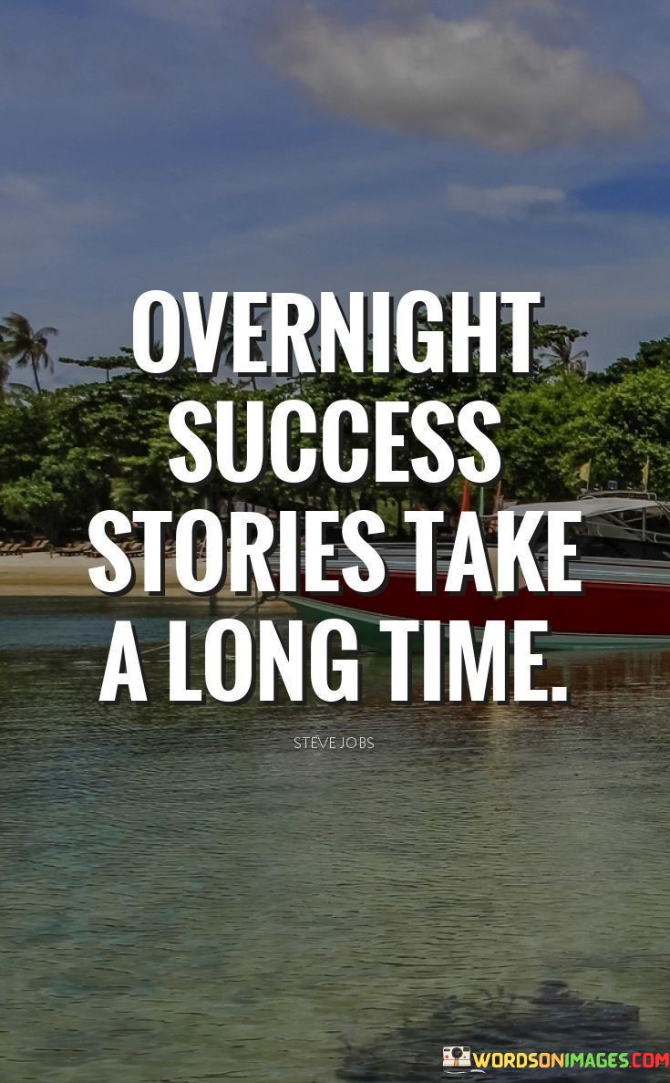 The phrase "Overnight Success Stories Take A Long Time" serves as a reminder that what may appear to be sudden success is often the result of years of effort and perseverance. It suggests that the journey to achievement is marked by gradual progress and continuous dedication.