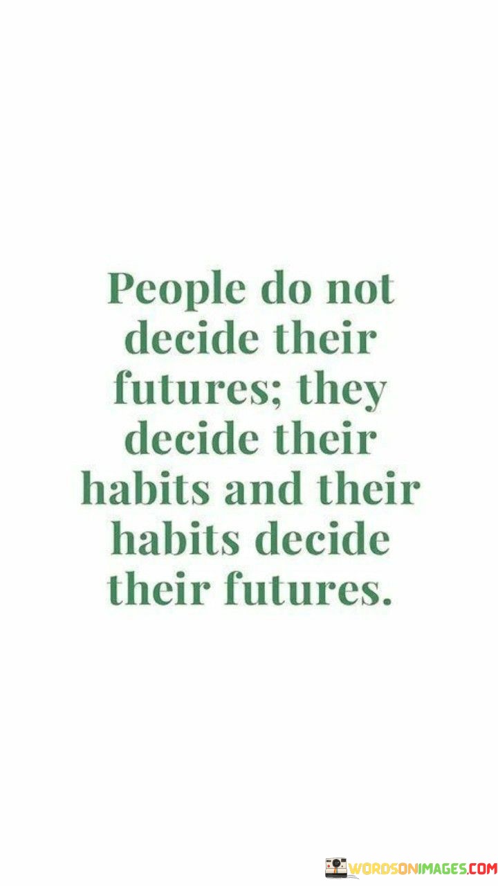 The quote addresses the role of habits in shaping outcomes. It suggests that individuals' futures aren't determined by random chance, but by the choices they make consistently—namely, their habits. These habits play a pivotal role in determining the trajectory of one's life.