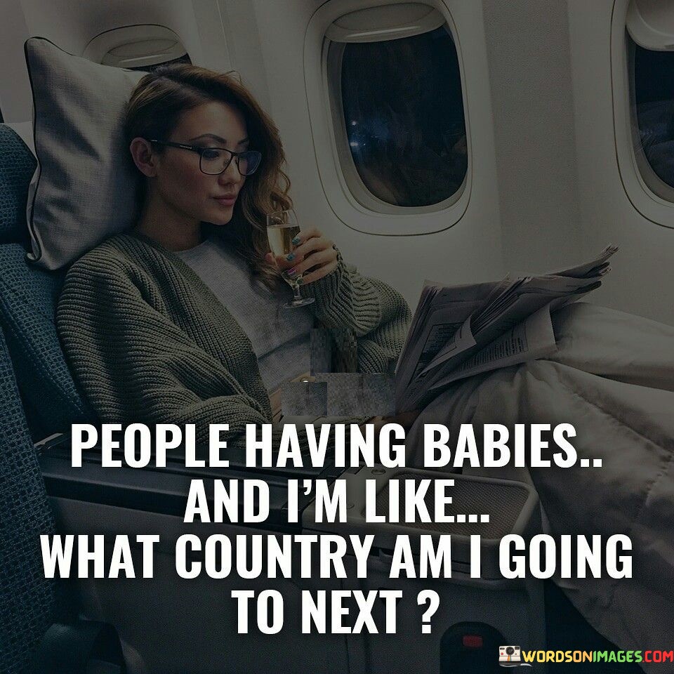The quote juxtaposes different life choices. The phrase "people having babies" alludes to a common milestone, symbolizing settling down and starting a family.