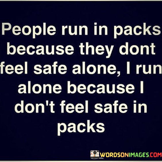 The quote contrasts the motivations behind group behavior and individualism. It suggests that some people seek safety and comfort in groups, while the speaker prefers solitude due to a lack of security in group dynamics. This viewpoint highlights the complexity of social interactions and personal preferences.
