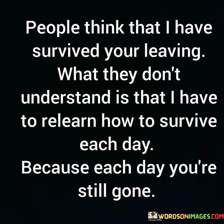 The quote conveys the enduring impact of loss. "Survived your leaving" implies resilience. "Relearn how to survive each day" underscores the ongoing struggle. The quote highlights the continuous process of coping with the absence of a loved one.