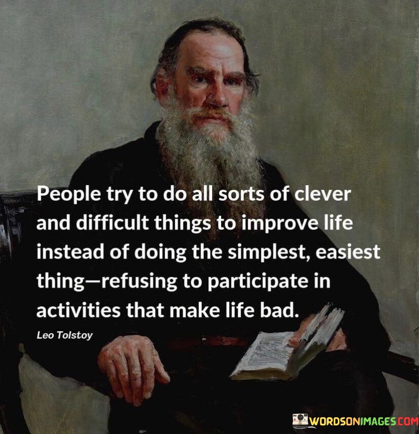 The quote advocates for simplicity in improving life. It suggests that people often resort to complex strategies instead of avoiding harmful activities. Instead of pursuing elaborate solutions, the quote encourages refusing engagement in actions that have negative impacts, promoting the idea that avoiding harm is a straightforward path to betterment.