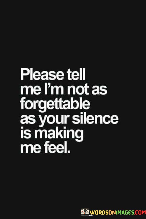 This quote reflects a deep sense of insecurity and vulnerability in the speaker's emotions. It conveys the idea that the silence of someone else, likely the person they're addressing, is causing them to question their worth and significance. The speaker is seeking reassurance and validation from the other person, hoping to be acknowledged and reminded that they are not easily overlooked or dismissed.