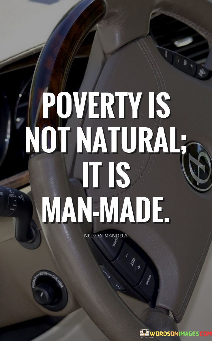 The quote "Poverty is not natural; it is man-made" highlights the belief that poverty is not an inherent or inevitable condition, but rather a result of human actions, policies, and systems. It challenges the notion that poverty is simply a consequence of natural factors or individual shortcomings, and instead points to the role that societal structures and decisions play in perpetuating poverty. The quote suggests that poverty is a social construct, created and sustained by human actions and decisions. Economic inequality, lack of access to resources, limited opportunities, and discriminatory practices are among the factors that contribute to the creation and perpetuation of poverty. These are often the result of decisions made by governments, institutions, and individuals that shape the distribution of wealth, power, and resources in society. By emphasizing that poverty is man-made, the quote calls for accountability and a recognition of the collective responsibility to address and alleviate poverty. It implies that poverty is a problem that can be tackled through deliberate actions, policies, and reforms that address its root causes. Moreover, the quote challenges the idea that poverty is an unchangeable or natural state. It points to the potential for human agency and intervention to bring about positive change and create a more equitable society. It suggests that by addressing the underlying social, economic, and political factors that contribute to poverty, it is possible to uplift communities and improve the well-being of marginalized populations. The statement also calls for a shift in perspective and a more compassionate understanding of poverty. By recognizing poverty as a man-made phenomenon, it challenges stigmatizing attitudes and encourages empathy and solidarity with those experiencing poverty. It reminds us that poverty is not a personal failure but a reflection of systemic issues that need to be addressed collectively. In conclusion, the statement "Poverty is not natural; it is man-made" asserts that poverty is a social construct, created and sustained by human actions, policies, and systems. It challenges the idea that poverty is an inevitable condition and calls for a recognition of the collective responsibility to address and alleviate poverty. By acknowledging poverty's man-made nature, we can foster a more compassionate and proactive approach to tackle its root causes and work towards building a more just and equitable society.