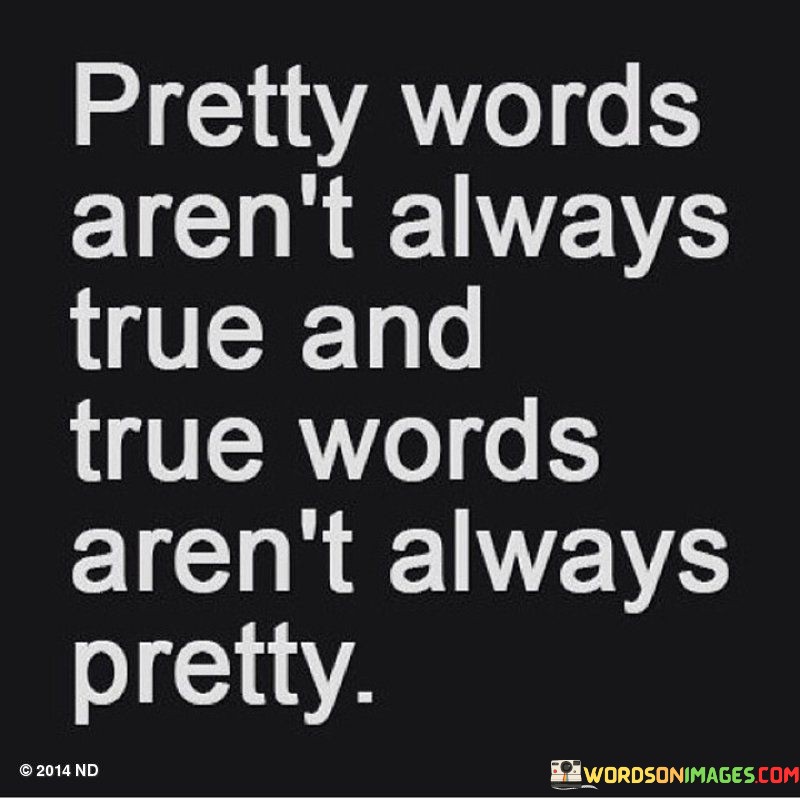 Deceptive allure. This quote conveys that words can be misleading, as attractive or eloquent expressions may not always reflect truth. It cautions against accepting statements solely based on their aesthetic appeal, emphasizing the importance of critical thinking and discernment in assessing the authenticity behind seemingly beautiful words.