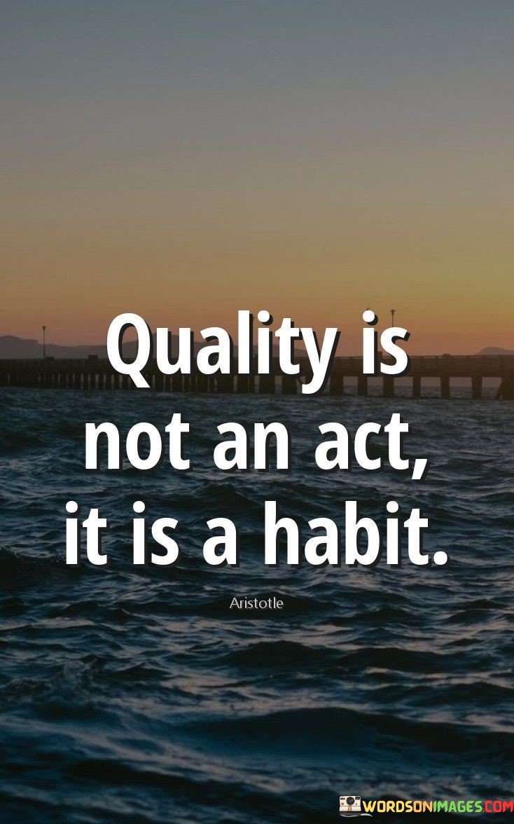 The quote "Quality is not an act, it is a habit" conveys a profound insight into the essence of achieving excellence in all aspects of life. It highlights that true quality is not the result of isolated efforts or occasional acts of brilliance, but rather a consistent and ingrained pattern of behavior. In essence, excellence is a habit, a way of approaching tasks and responsibilities with unwavering dedication and attention to detail. When we cultivate habits that prioritize quality, we ensure that every action we take is marked by a commitment to deliver the best possible outcome. This quote finds its roots in Aristotle's philosophy, who believed that virtue and excellence are not occasional acts but rather the products of consistent practice. By transforming excellence into a habit, we move beyond merely performing well in isolated instances and begin to embody a higher standard of living. Whether it be in our personal relationships, professional endeavors, or self-improvement pursuits, adopting a habitual pursuit of quality becomes the cornerstone of success. Moreover, cultivating the habit of quality extends beyond the notion of perfectionism; it involves a continuous process of learning and growth. Each time we strive for excellence, we learn from our experiences, identify areas for improvement, and refine our approaches accordingly. Over time, this habit of seeking quality becomes second nature, and we find ourselves consistently delivering exceptional results. In a broader context, this quote serves as a powerful reminder that success is not about momentary brilliance but rather the accumulation of small, consistent efforts directed towards excellence. By making quality a habit, we set ourselves on a path of continuous improvement and fulfillment, transcending mediocrity and embracing a life of purpose and significance.