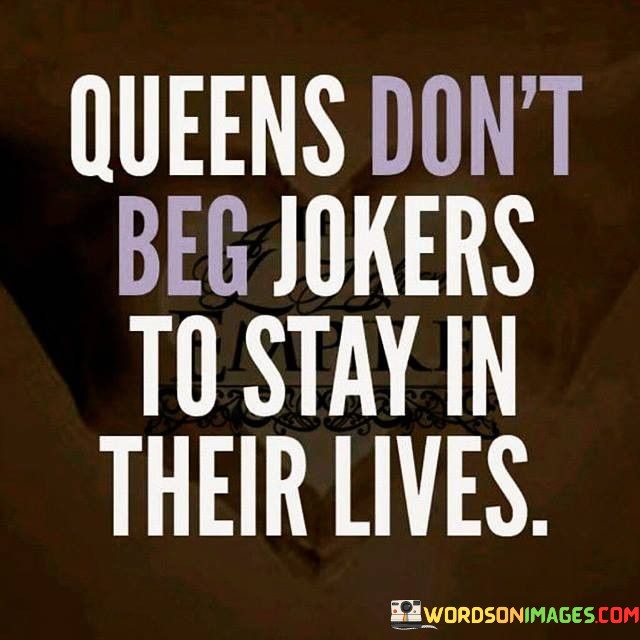 The quote "Queens don't beg jokers to stay in their lives" is a powerful statement that conveys the idea of self-worth, independence, and empowerment. In a metaphorical sense, it portrays queens as strong, confident individuals who understand their own value and refuse to settle for anything less.