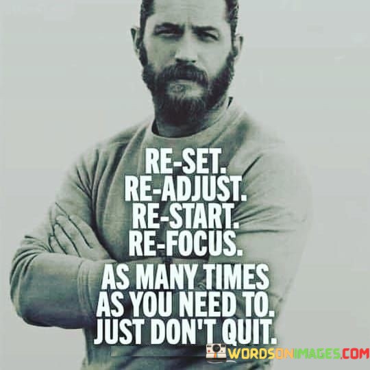 The quote "Reset, readjust, restart, refocus, as many times as you need to. Just don't quit" embodies a powerful message of perseverance, resilience, and the importance of never giving up in the face of challenges. Life is an unpredictable journey, and it is inevitable that we encounter obstacles, setbacks, and moments of self-doubt along the way. However, the key to success lies not in avoiding these hurdles but in our ability to respond to them with determination and adaptability. The quote encourages us to embrace a growth mindset, recognizing that failure and setbacks are not indicators of defeat but opportunities for growth and learning. By allowing ourselves the freedom to reset and readjust, we open the door to continuous improvement. Life rarely follows a linear path, and sometimes we may need to restart our efforts or refocus our energies on different aspects of our goals. This adaptability is crucial because it enables us to respond to changing circumstances and discover new perspectives that lead us closer to our aspirations. The phrase emphasizes the importance of resilience and persistence. The journey towards achieving our dreams can be arduous, and there might be moments when we feel overwhelmed, discouraged, or tempted to quit altogether. However, the quote serves as a powerful reminder to keep going, even when the going gets tough. Instead of succumbing to defeat, we are encouraged to summon the strength to try again and again, each time stronger and more determined than before.