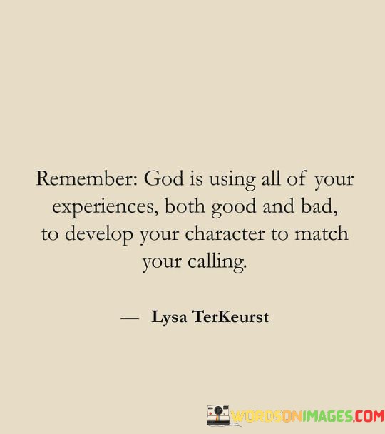 In summary, this quote invites us to view our life experiences through a spiritual lens, recognizing that they are all part of a greater plan to shape our character in preparation for our unique calling or purpose. It encourages us to embrace the lessons and growth that come from both the good and the bad experiences, knowing that God is using them to prepare us for our greater mission in life.