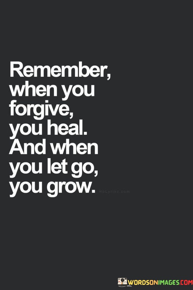 The quote, "Remember, when you forgive, you heal. And when you let go, you grow," encapsulates a profound lesson in the transformative power of forgiveness and letting go. It underscores the idea that holding onto grudges, resentment, or past hurts only perpetuates emotional pain and stagnation. On the other hand, choosing to forgive and release negative attachments enables us to experience healing and personal growth. The quote serves as a powerful reminder that forgiveness is not only a gift we offer to others but also a powerful act of self-compassion and liberation. By embracing the capacity to forgive and let go, we free ourselves from the burdens of the past and open the door to self-discovery, resilience, and emotional well-being. At its core, the quote highlights the profound impact of forgiveness on our emotional and mental well-being. When we choose to forgive those who have wronged us, we release the grip of anger, resentment, and bitterness, allowing space for healing to occur. Forgiveness is an act of compassion and understanding, acknowledging that all individuals are fallible and capable of mistakes. It enables us to break free from the cycle of pain and to reclaim our emotional freedom. Moreover, the quote emphasizes the transformative nature of letting go. When we release attachments to past events, toxic relationships, or self-limiting beliefs, we create space for personal growth and renewal. Letting go involves the willingness to shed old patterns that no longer serve us, embrace change, and move forward with a sense of purpose and resilience. Furthermore, the quote highlights the interconnectedness between forgiveness and personal growth. By forgiving others and ourselves, we create an opportunity for inner healing and self-discovery. Forgiveness enables us to learn valuable lessons from past experiences and empowers us to make more informed and compassionate choices in the future. In conclusion, the quote "Remember, when you forgive, you heal. And when you let go, you grow" illuminates the transformative power of forgiveness and letting go. It reminds us that forgiveness is a profound act of self-compassion that liberates us from emotional pain and allows for healing and growth to occur. Letting go of negative attachments and self-limiting beliefs enables us to embrace personal growth and resilience. By practicing forgiveness and letting go, we pave the way for emotional well-being, self-discovery, and a more fulfilling life journey. The quote serves as a powerful invitation to embrace forgiveness and release, creating a path towards healing, growth, and inner liberation.