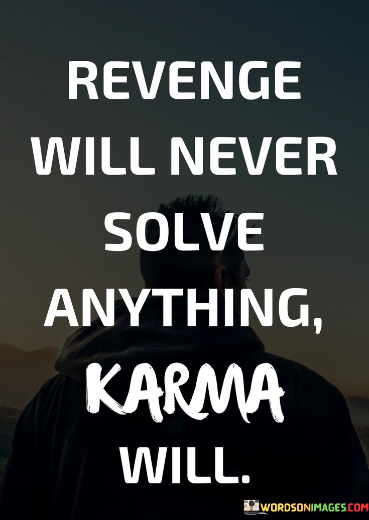 The quote juxtaposes revenge and karma. It suggests that seeking revenge doesn't bring resolution, while karma, the belief in cosmic justice, will eventually balance things. Revenge perpetuates negativity, whereas karma implies that one's actions will have consequences, guiding individuals to do good rather than seeking vengeance.