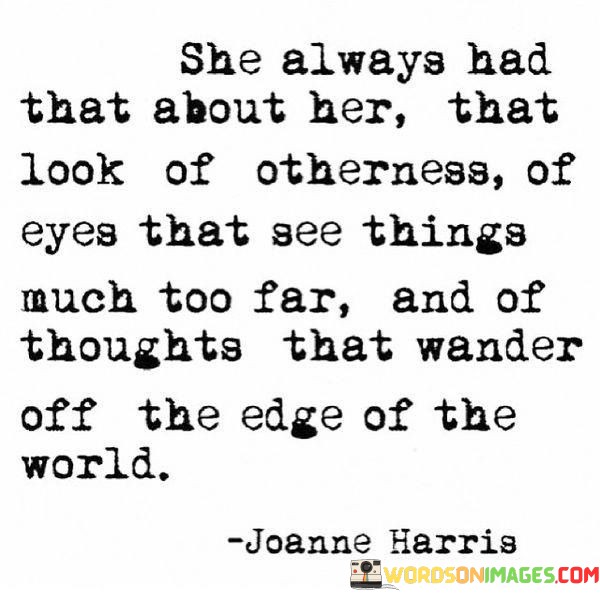 This evocative quote describes a woman who possesses a unique and captivating aura of "otherness." It highlights her distinctiveness and individuality, which set her apart from others. The phrase "that look of otherness" suggests that she carries an air of mystery and depth, drawing people's attention and curiosity.