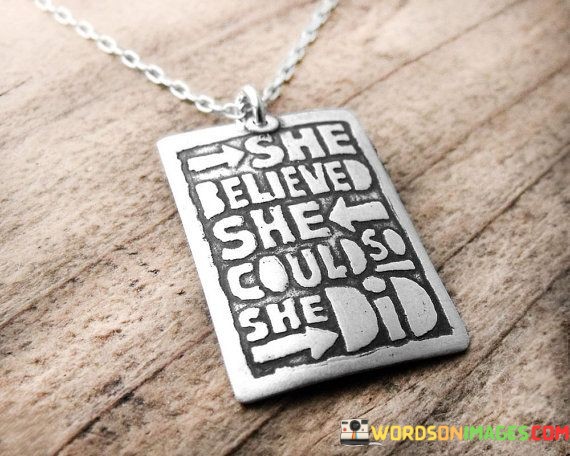 This quote, "she believed she could so she did," encapsulates the essence of the power of self-belief and determination. At its core, it emphasizes the profound impact of one's mindset and confidence in achieving their goals and aspirations. The word "she" represents any individual, regardless of gender, who possesses unwavering faith in their abilities and potential. This unwavering belief serves as a driving force, propelling them forward to overcome obstacles and challenges, ultimately leading to success.The phrase highlights the intimate connection between belief and action, suggesting that a strong conviction in one's capabilities fuels the motivation to take concrete steps towards achieving their dreams. It reflects the idea that self-doubt and fear can be conquered through the strength of a positive and determined mindset. When someone truly believes in their capacity to accomplish something, they unleash their full potential, channeling their energy into relentless efforts, perseverance, and hard work.