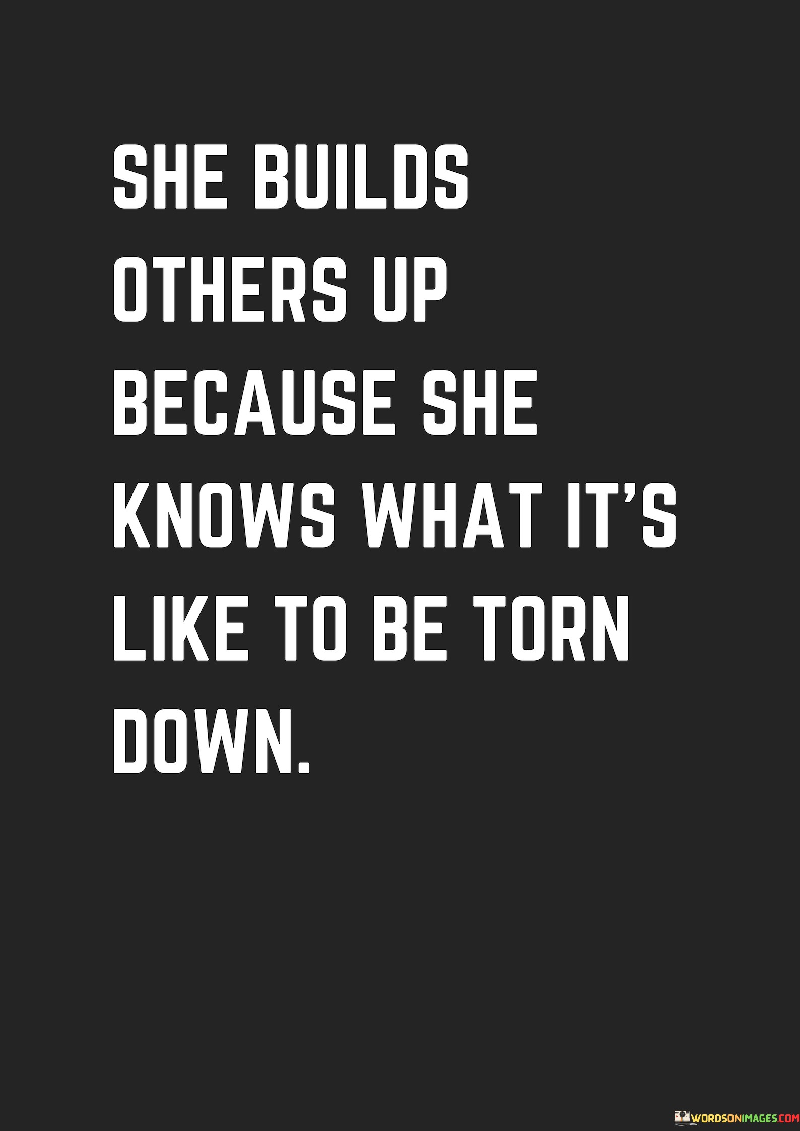 This poignant quote captures the essence of empathy, compassion, and resilience. It portrays a person who uplifts and supports others because they have experienced the pain of being torn down themselves. By understanding the struggles and challenges of being brought down, the individual has gained a deep sense of empathy and a desire to make a positive impact on the lives of others. Rather than perpetuating a cycle of negativity, they choose to build others up, recognizing the transformative power of kindness and encouragement.The quote highlights the strength that can arise from adversity. When someone has faced adversity and endured being torn down, they have the unique ability to empathize with others going through similar experiences. This shared understanding fosters a profound connection, allowing them to offer genuine support and encouragement to those in need. Their acts of kindness become a way of lifting others from the depths of despair, inspiring hope and fostering resilience in others' lives.Furthermore, this quote embodies the idea that our own experiences, both positive and negative, can shape us into individuals who choose to make a positive impact on the world around us. Instead of allowing their past hardships to embitter them, the person described here harnesses their understanding of pain to create a ripple effect of positivity and empowerment. Their actions become a testament to the indomitable spirit of those who choose to rise above their own struggles and extend a helping hand to others.In essence, this quote serves as a powerful reminder of the human capacity for compassion and the transformative power of empathy. It encourages us to be a force for good, uplifting and empowering others with the wisdom and strength gained from our own life experiences. By building others up, we contribute to a world where kindness, understanding, and support prevail, fostering a community of resilience and love.