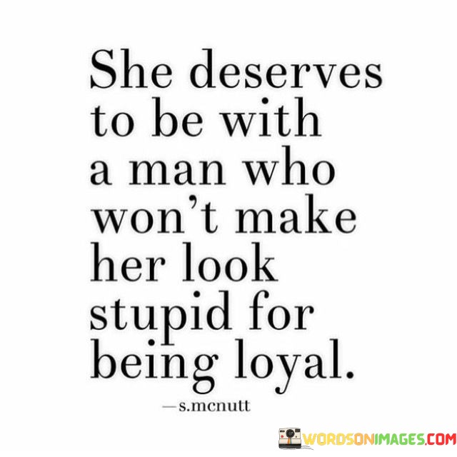 This statement emphasizes the importance of being with a partner who values and appreciates a woman's loyalty rather than making her feel foolish for it. She deserves to be with a man who won't make her look stupid for being loyal" suggests that the woman deserves a partner who respects and admires her commitment and faithfulness.