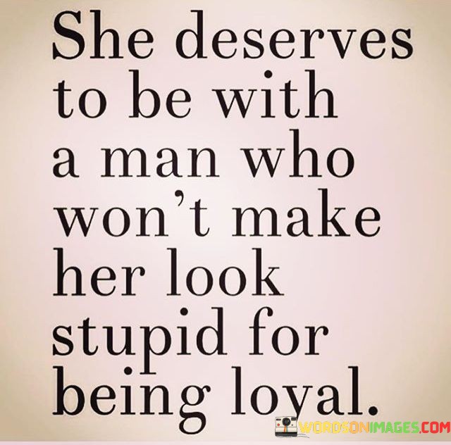This powerful quote speaks to the importance of respect and appreciation in a relationship, particularly when it comes to loyalty. The phrase "she deserves to be with a man" suggests that the person being referred to is in a romantic relationship, and it emphasizes that she deserves a partner who treats her with dignity and kindness. The quote implies that this woman values loyalty and remains devoted to her partner, but sadly, her loyalty has been taken for granted or used against her. The phrase "won't make her look stupid for being loyal" implies that her partner should not belittle or mock her for her commitment and faithfulness. Instead, the quote advocates for a partner who cherishes and values her loyalty, seeing it as a beautiful and admirable quality that should be celebrated, not ridiculed.This quote is a call for mutual respect and understanding in relationships. It recognizes the significance of loyalty as a fundamental virtue and the importance of being with someone who appreciates and reciprocates that loyalty. The phrase "won't make her look stupid" addresses the emotional impact of feeling disrespected or ridiculed for being true to one's commitments. It conveys a sense of empowerment, urging the woman to recognize her worth and not settle for a partner who fails to recognize the value of her loyalty. Moreover, the quote is a reminder to all individuals about the importance of treating their partners with kindness, empathy, and appreciation, acknowledging the significance of loyalty in fostering a healthy and fulfilling relationship.In essence, this quote is a powerful message advocating for the recognition and celebration of loyalty within relationships. It urges individuals to be with partners who respect and value their commitment, never subjecting them to ridicule or making them feel inadequate for being faithful. It speaks to the importance of fostering an environment of trust, support, and mutual appreciation, where loyalty is regarded as a cherished quality that strengthens the bond between partners. Ultimately, the quote serves as a reminder of the importance of cultivating healthy, loving relationships that honor and uplift each partner, celebrating the virtues of loyalty and commitment.