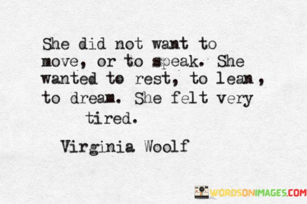 This poignant quote depicts a moment of exhaustion and weariness experienced by a woman who longs for respite and solace. The phrase "she did not want to move or to speak" portrays her desire to retreat from the demands of the world and withdraw into a tranquil state of stillness. It suggests a need for inner reflection and contemplation, as she yearns for a moment of pause and introspection. The phrase "she wanted to rest to lean to dream" further emphasizes her longing for a reprieve, both physically and mentally. It conveys her desire to find comfort and support, seeking solace in leaning on something stable and immersing herself in a world of dreams. The quote captures a profound sense of fatigue, as the woman "felt very tired," signifying the weight of emotional and physical exhaustion she bears. This quote serves as a powerful reminder of the importance of self-care and taking moments of rest to rejuvenate the mind and body. It underscores the significance of acknowledging one's limitations and embracing the need for rest and reflection to maintain emotional well-being and inner strength. It resonates with anyone who has experienced moments of weariness and seeks comfort and restoration through solitude and introspection, reminding us of the value of granting ourselves the time and space to heal and replenish our spirits.
