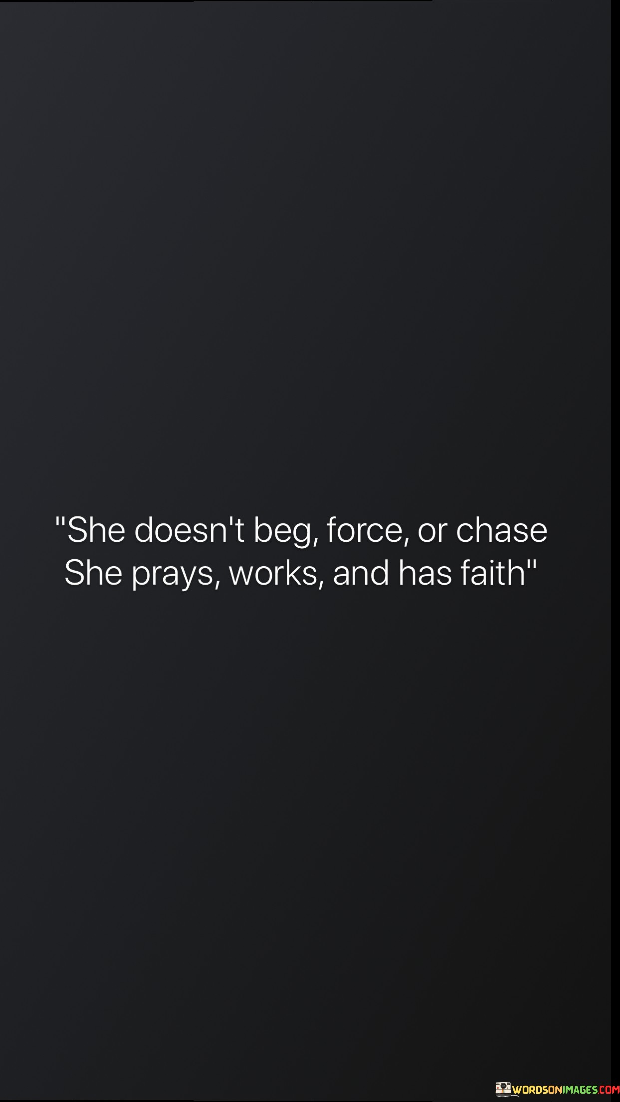 This quote portrays a woman who exemplifies patience, dignity, and inner strength in her approach to life and relationships. It contrasts her actions with forceful or desperate behaviors, highlighting the power of her faith and hard work instead.