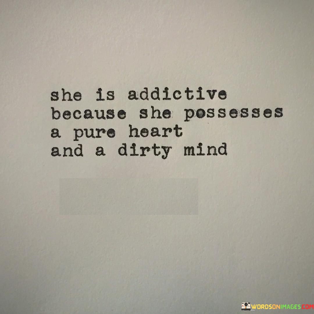 The phrase "she is addictive" indicates that her personality and the unique blend of these qualities have a captivating and alluring effect on others.