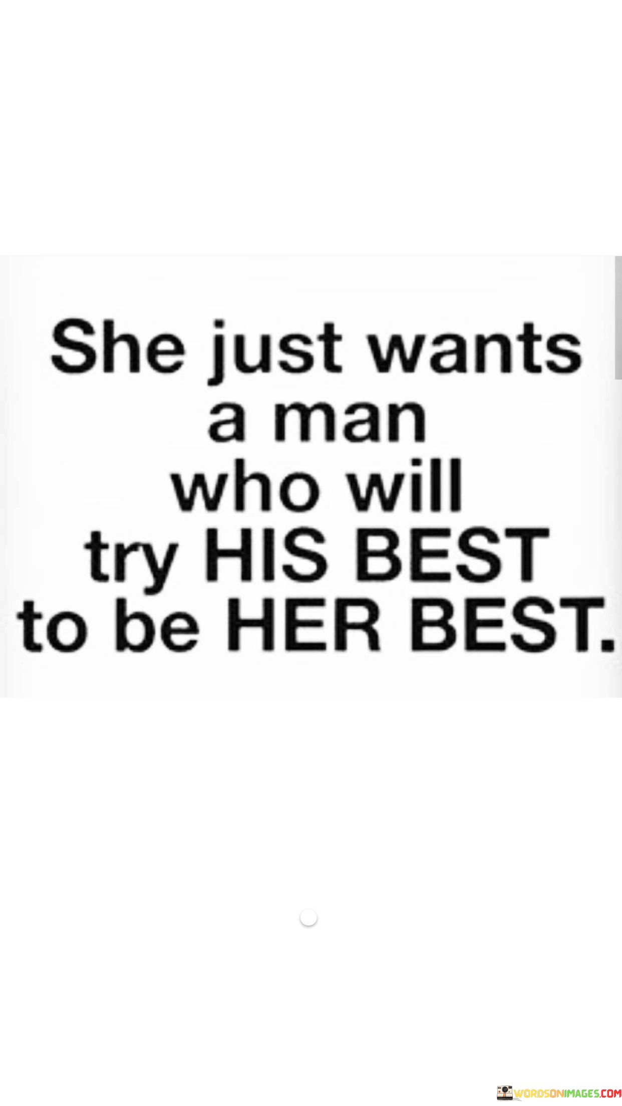 By saying "She just wants a man who will try his best to be her best," it emphasizes the importance of mutual growth and support in a healthy relationship. The woman seeks a partner who will make an effort to understand and meet her needs, be considerate of her feelings, and support her goals and aspirations.