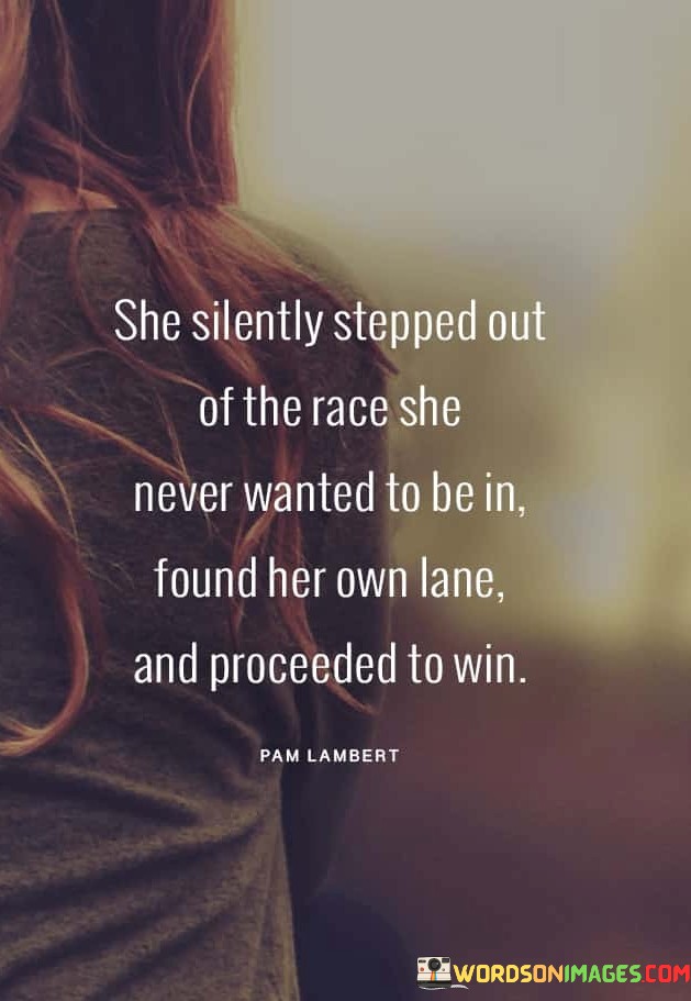 This quote beautifully encapsulates the power of individuality and self-discovery. It portrays a person who courageously chooses to step away from societal expectations and norms, represented metaphorically as a "race" they never desired to be a part of. In doing so, they free themselves from the pressures of conforming to others' expectations and embark on a journey of self-discovery. By finding their own unique "lane," they discover their true passions, values, and strengths. As they embrace their individuality, they gain a sense of purpose and direction, allowing them to thrive and excel in their chosen path. The phrase "proceeded to win" suggests that by staying true to themselves, they achieve success on their own terms, irrespective of conventional definitions of victory. This quote serves as a reminder that embracing authenticity and having the courage to carve one's path lead to the most fulfilling and triumphant outcomes in life.