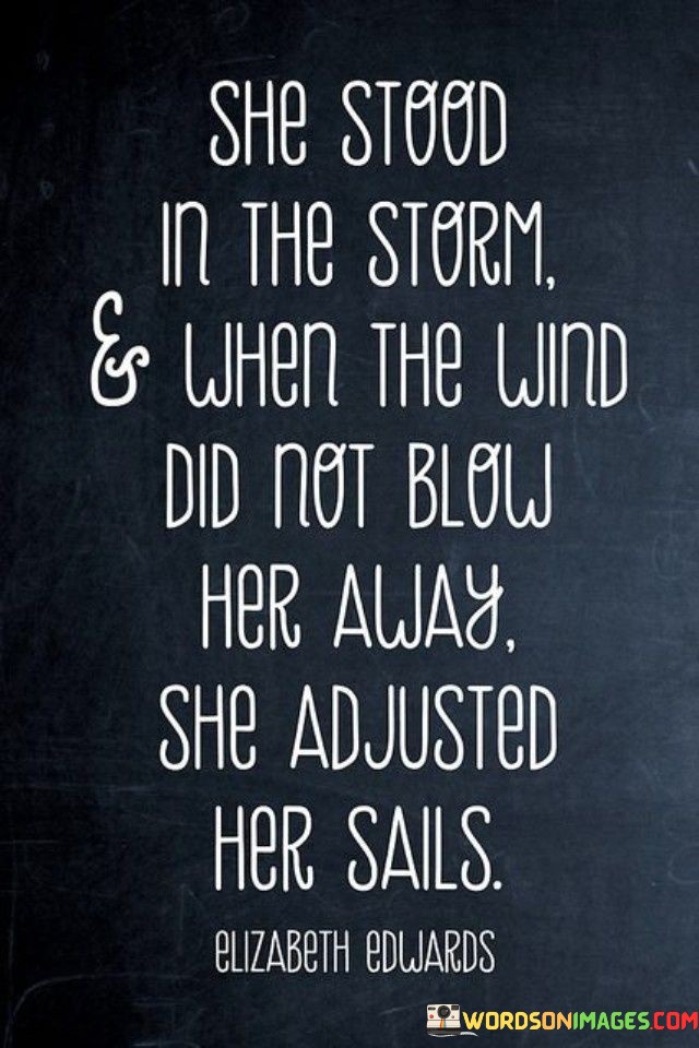 This powerful quote embodies resilience and adaptability in the face of adversity. The image of "standing in the storm" represents a person who confronts challenges and difficulties head-on, refusing to be overwhelmed by life's tempestuous circumstances. The storm symbolizes the trials and hardships that life may throw at us, but the person depicted here remains steadfast and determined, not allowing the turbulent winds to knock her down. Instead, she shows a remarkable capacity to adjust her sails, indicating her ability to adapt and find a way to navigate through the storm. This metaphor highlights her strength in facing adversity, demonstrating a willingness to change course, make necessary adjustments, and forge ahead despite the challenges.The quote serves as an empowering message of resilience and the importance of adaptability in life's journey. It reminds us that no matter how difficult the circumstances, we can find inner strength to withstand the storms that come our way. Rather than being defeated by the winds of adversity, we have the power to adjust our sails and change our approach, overcoming obstacles and continuing on our chosen path. It emphasizes the value of perseverance and flexibility, as we can learn to navigate through life's storms, making the best of challenging situations and emerging stronger and wiser on the other side.Furthermore, the quote suggests that facing adversity can be a transformative experience. The storm, though daunting, presents an opportunity for growth and self-discovery. By standing firm and adjusting her sails, the person in the quote not only overcomes the immediate challenges but also learns to harness the power of the winds to move forward with purpose and resilience. This portrayal encourages us to embrace life's challenges as opportunities for growth and to view obstacles as a chance to develop the skills needed to navigate through life's uncertainties successfully.In essence, this quote is a testament to the indomitable spirit of individuals who can withstand life's storms and emerge stronger by adapting to the challenges they face. It inspires us to face adversity with courage and flexibility, knowing that we have the power to adjust our sails and navigate through life's trials. By embracing our resilience and adaptability, we can weather the storms that come our way and chart our course to greater strength and growth.