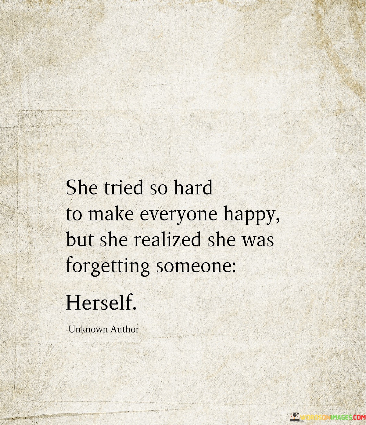 This quote reflects the struggle many women face in trying to please everyone around them, often at the expense of their own well-being. The phrase "she tried so hard to make everyone happy" suggests that this woman devoted a significant amount of time and energy to meeting the expectations and needs of others.