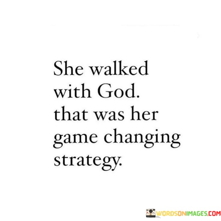 The quote "She Walked With God, That Was Her Game-Changing Strategy" conveys a powerful message of the transformative impact of faith and a close relationship with God. It suggests that a person's decision to walk with God—meaning to live their life in alignment with their faith and values—is a strategic choice that can bring about significant positive changes.