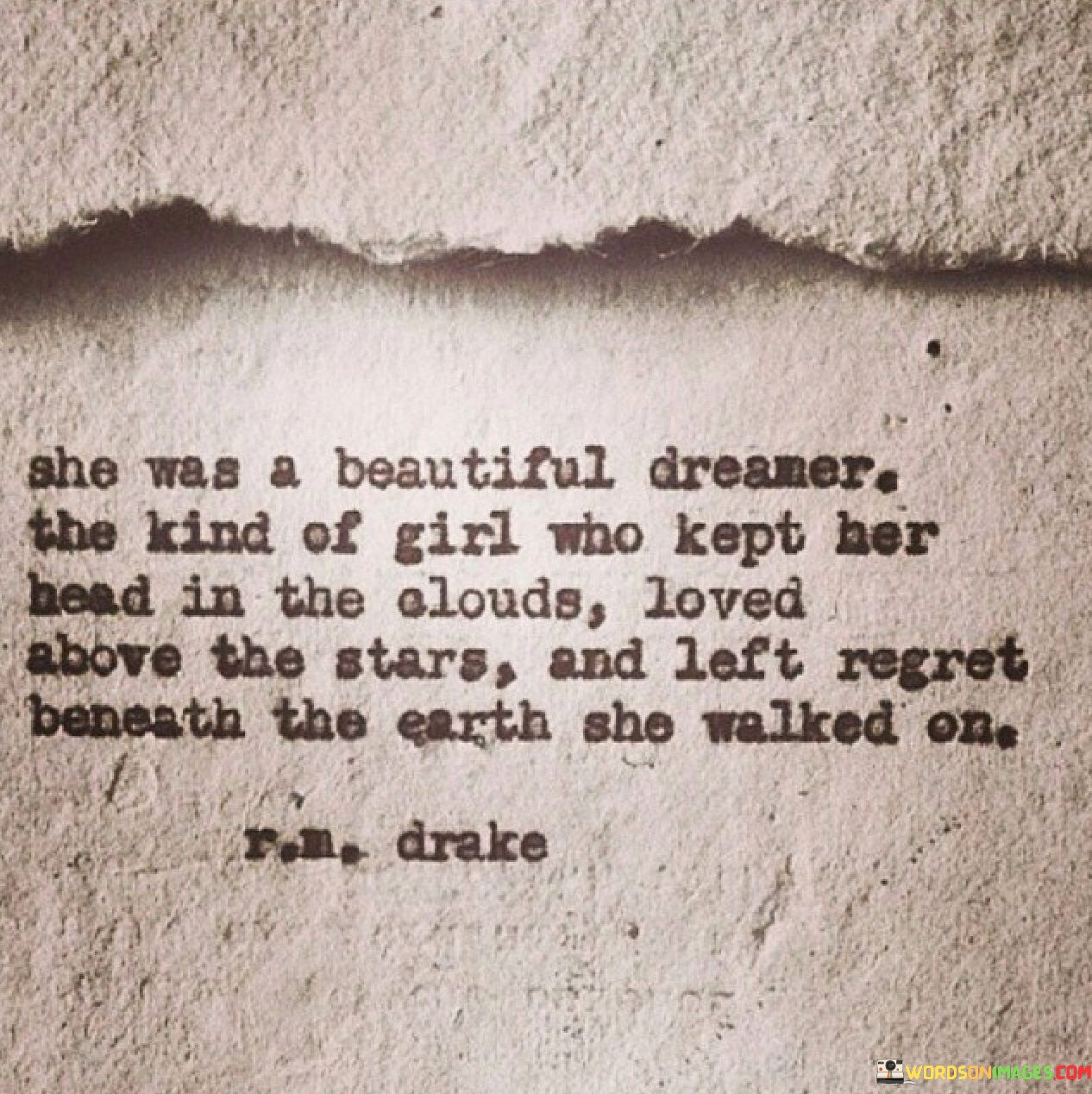This poetic description portrays a woman with a rich inner world and a boundless spirit. She is depicted as a dreamer, someone who envisions a world beyond the ordinary and embraces the beauty of imagination.
